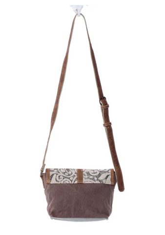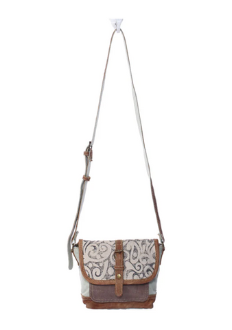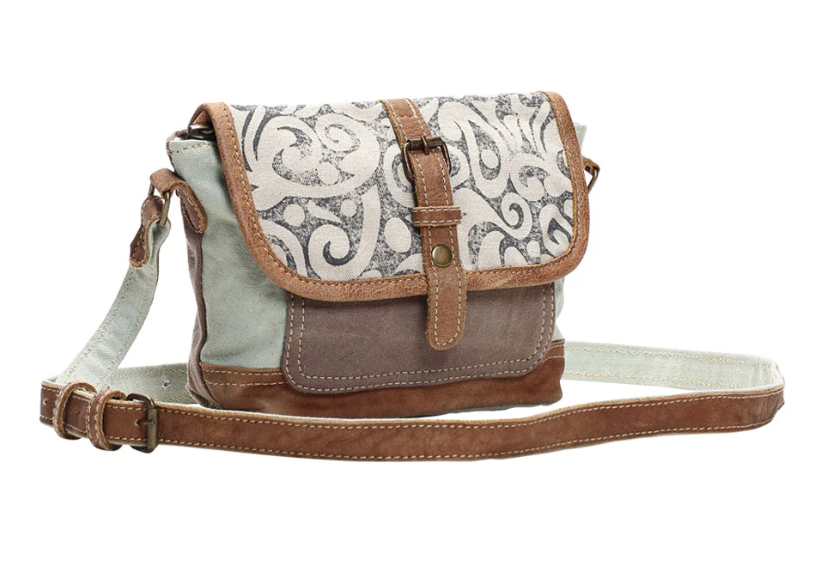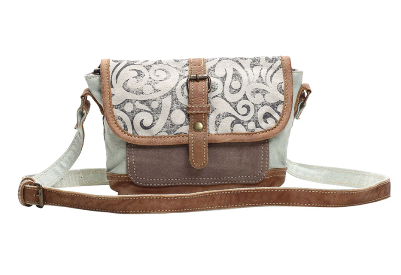 Crafted from durable canvas and supple leather, this crossbody bag combines practicality with artistic flair. The abstract leaf swirl print adds visual interest to an everyday essential. Measuring 10.5" wide by 6.5" tall, it offers compact yet functional storage. The adjustable 23.5" shoulder strap ensures comfortable wear across body or over the shoulder. The flapover design provides secure closure while maintaining easy access. Perfect for those seeking a versatile accessory that balances style and utility.