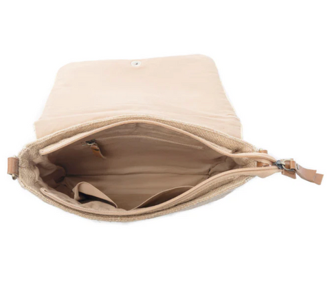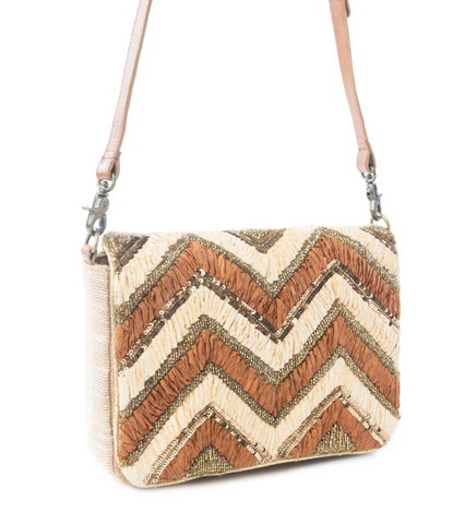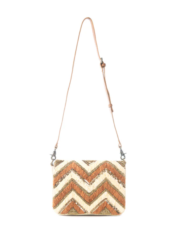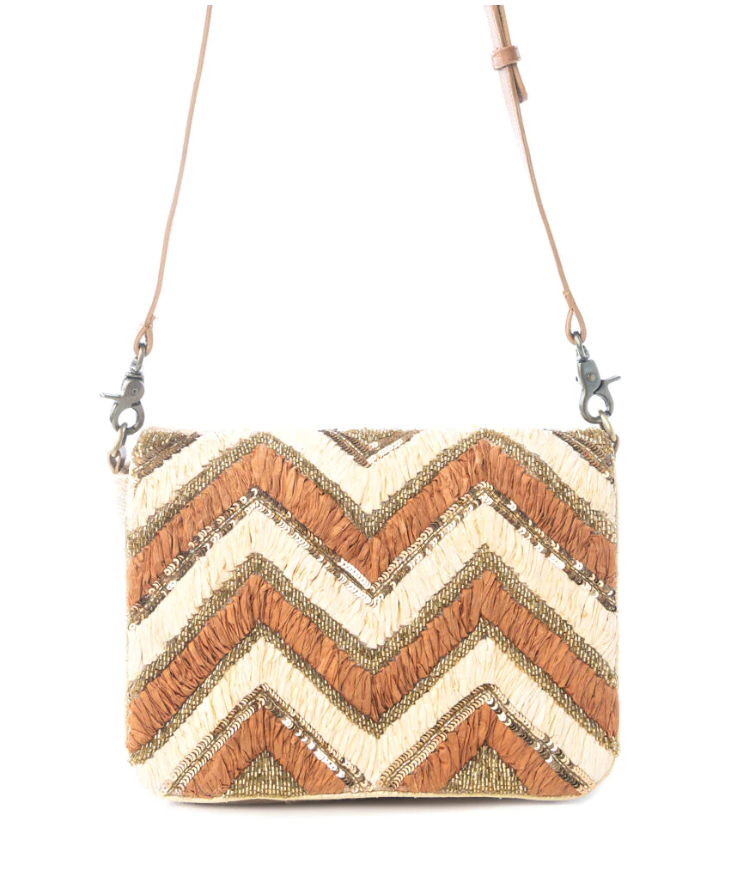 The Velvet Ember Crossbody Bag in Golden Shadow combines sophisticated design with practical functionality. Crafted from premium leather with golden, terracotta, and olive shades in a chevron pattern, this piece delivers both artistry and everyday utility. The lightweight cotton base ensures comfortable all-day wear, while the adjustable shoulder strap accommodates individual preferences. An interior phone compartment keeps your device accessible, and a dedicated pocket secures smaller essentials. Measuring 9.75" W x 7" H x 1.75" D with a 23" adjustable strap, this crossbody transitions seamlessly from casual outings to refined occasions, making it an essential accessory for the discerning traveler.