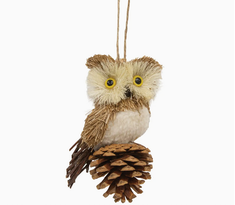 Bring woodland charm to your holiday tree with this expertly crafted Sisal Owl on Pinecone Ornament. Standing 5 inches tall, this nature-inspired piece combines rustic sisal texturing with authentic pinecone detailing for an organic aesthetic. The owl's thoughtful design captures seasonal elegance while maintaining a timeless appeal that complements both traditional and contemporary holiday displays. A distinctive addition that elevates your festive décor with natural sophistication.