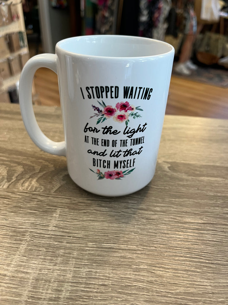 The Stopped Waiting For The Light Mug delivers bold humor with the phrase "I stopped waiting for the light at the end of the tunnel and lit that bitch myself." printed on both sides for clear visibility. Crafted from durable ceramic, this 15oz mug is designed for everyday use and is top rack dishwasher safe to preserve its vibrant design. Ideal for those who appreciate wit paired with practical functionality.