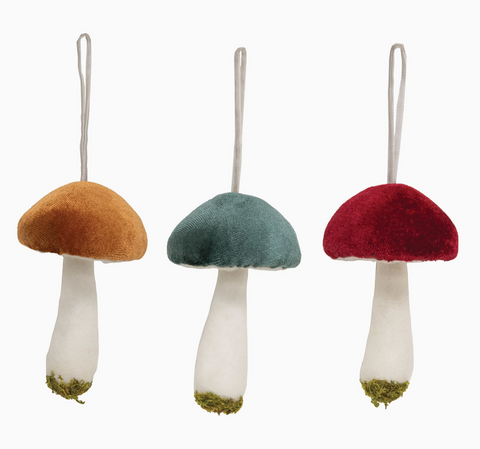 Bring woodland enchantment to your holiday décor with these handcrafted velvet mushroom ornaments. Each features a soft ivory stem topped with a luxuriously velvety cap in rich red, serene teal, or warm marigold. Authentic moss detailing adorns the base, enhancing the forest-inspired aesthetic. Suspended from a white string loop for effortless hanging, these ornaments measure 4.5" high by 2.5" in diameter, making them a striking addition to any tree or seasonal display.