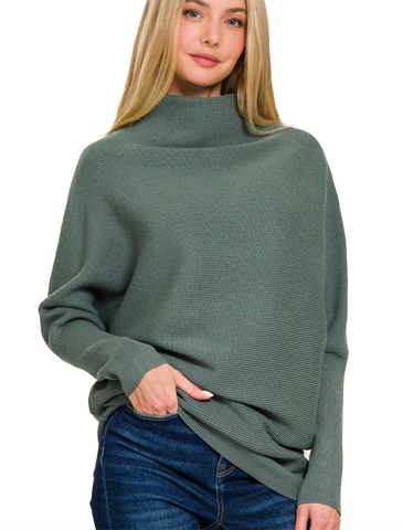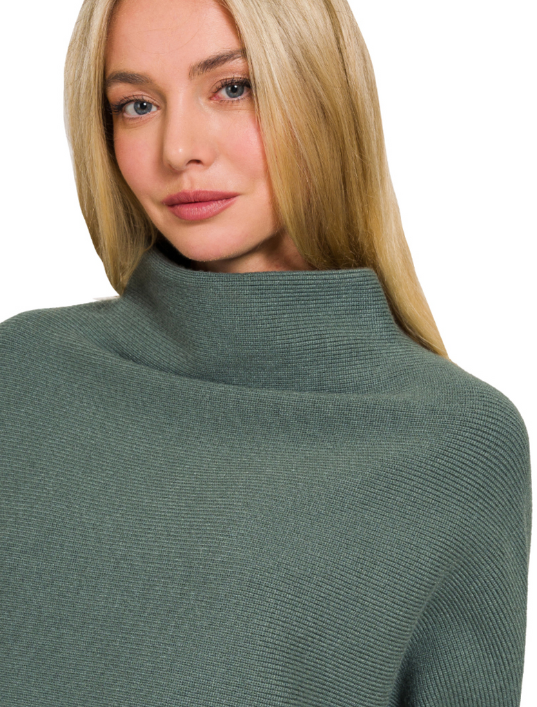 Crafted from a luxurious blend of 50% viscose, 28% nylon, and 22% polyester, this dolman sleeve mock neck sweater delivers sophisticated drape and lasting durability. The generous silhouette features a 30" front body length and approximately 48" chest measurement, offering comfortable, relaxed styling. Available in rich Cabernet or serene Ash Jade, this versatile piece transitions seamlessly from casual to polished occasions. The viscose-forward composition provides a fluid, elegant hand while nylon and polyester enhance shape retention and wear resistance. Sized S-L for inclusive fit options.