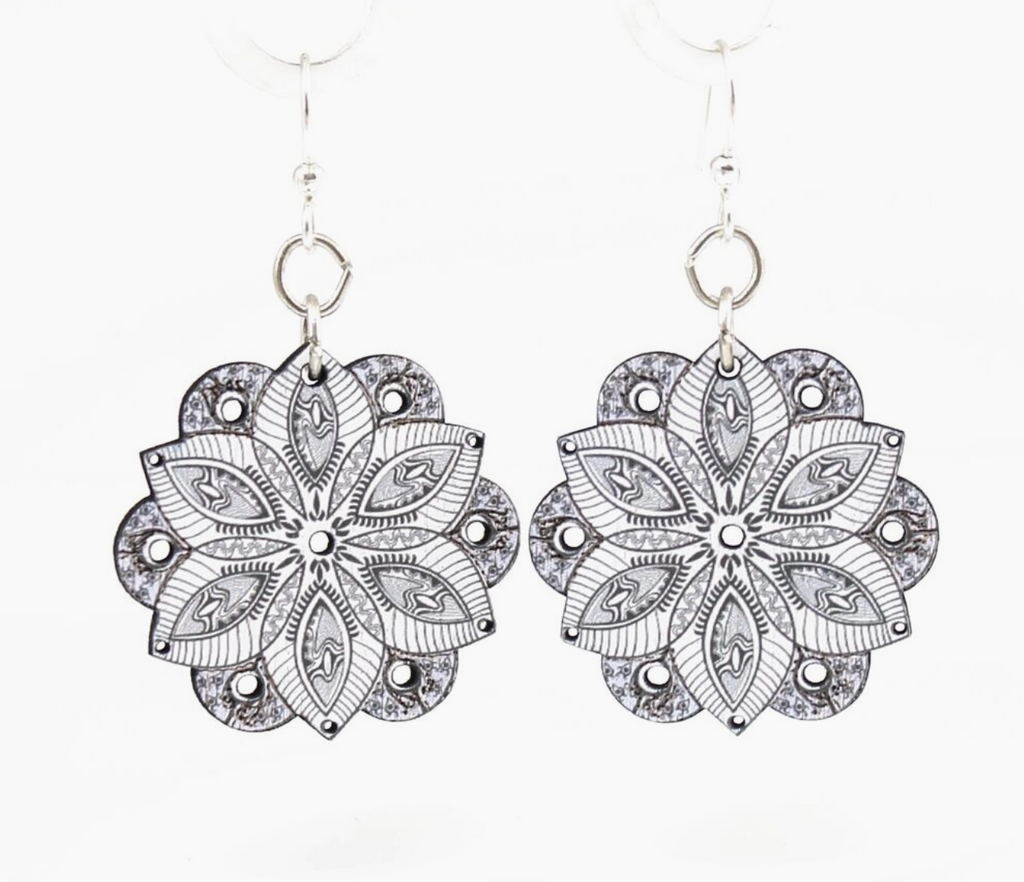 Made In U.S.A. Size 1.3" x 1.3". Black and White Lace Print Earrings - as shown. Made from sustainably sourced wood and 90% recycled display cards. Laser-cut wood Stained with water based dye. Ear wires are silver-finished 304L stainless steel, hypoallergenic, and enhanced with a new, smooth and consistent electrophoretic coating that resists tarnishing.